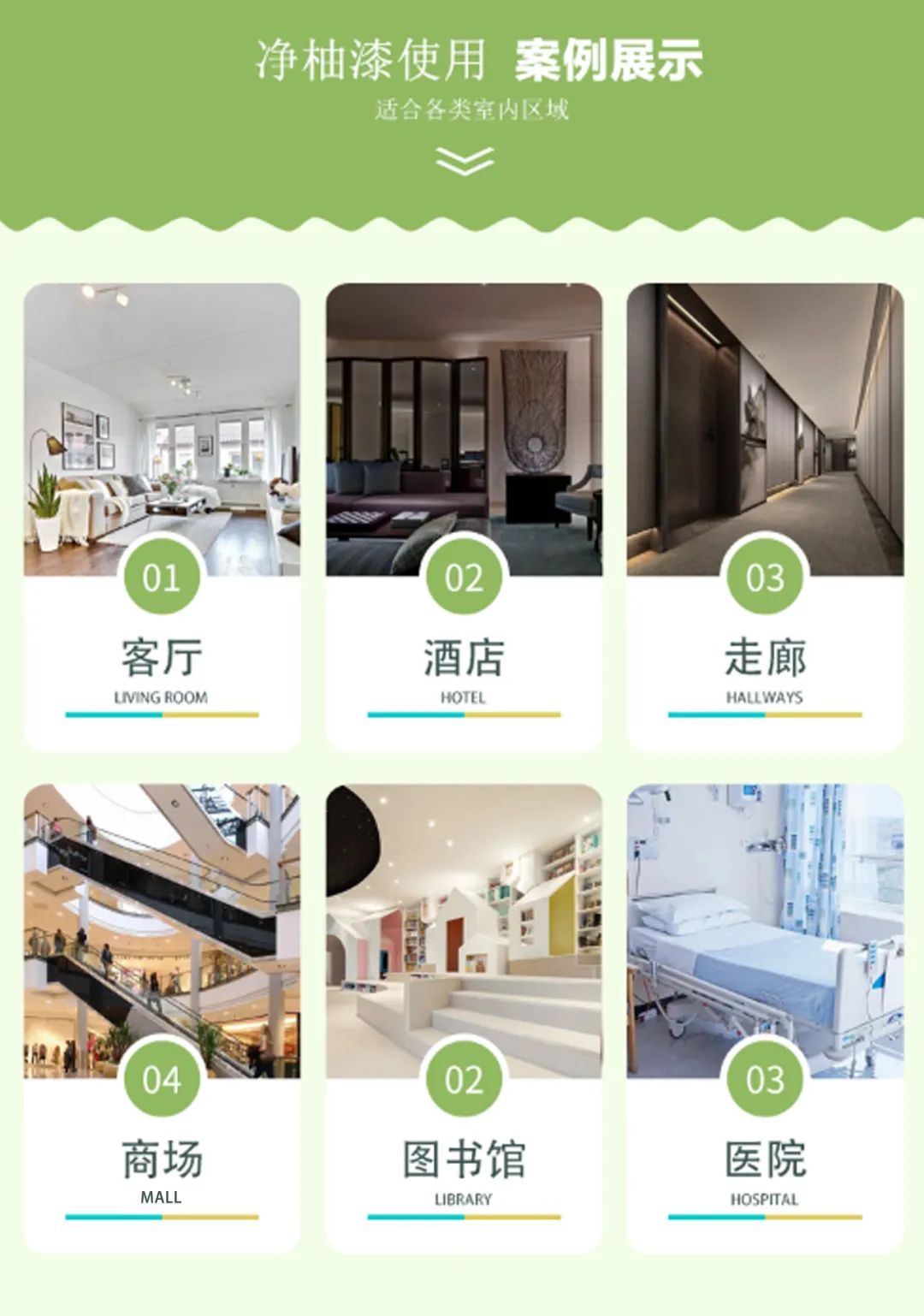 家居客廳、餐廳,酒店客房、走廊,展廳,商場,會所,醫(yī)院、公共交通等內墻面裝飾,可保持室
