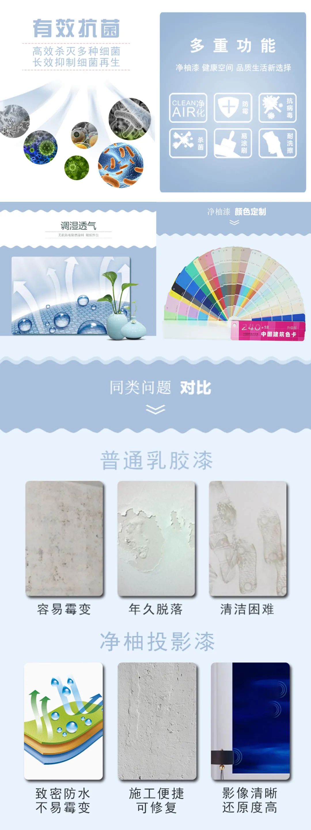 凈柚投影漆色彩真實(shí)呈現(xiàn):可媲美影院熒幕效果,投射影像清晰 真實(shí)、高度還原影像;亮度均一性高,無太陽效應(yīng),無反射現(xiàn)象;不受畫面尺寸限制、及曲面等限制;綠色環(huán)保,水性,超低 VOC,無任何氣味;自潔抗污可水洗,生活污漬一擦即凈,日常清潔簡單;自帶抗菌防霉功能;表干速度快,適用多種基材,可做曲面工藝。施工便捷,后期可修復(fù)。